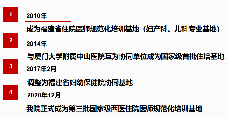 我院2010年成为福建省住院医师规范化培训基地(含妇产科、儿科专业基地,住院医师规范化培训以下简称住培),2014年与厦门大学附属中山医院互为协同单位成为国家级首批住培基地,2017年2月调整为福建省妇幼保健院协同基地。2020年12月我院正式成为第三批国家级西医住院医师规范化培训基地。2010年至今我院共招生200余人。妇产科专业、儿科专业结业考核通过率多次达到100%。我院带教师资长期承担厦门大学医学院、厦门大学MBBS、厦门医学院妇产科、儿科相关中英文理论、见习课程教学及实习带教,2021年挂牌厦门大学医学院妇产科学系、儿科学系,教学力量雄厚、教学经验丰富。