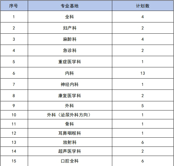 2017年获批第二批国家住院医师规范化培训基地,目前共有15个专业基地招生:内科、外科、外科(泌尿外科方向)、骨科、妇产科、耳鼻咽喉科、急诊科、神经内科、全科、康复医学科、放射科、超声医学科、麻醉科、口腔全科、重症医学科。