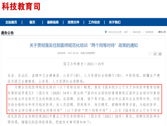 (一)《关于贯彻落实住院医师规范化培训“两个同等对待”政策的通知》(国卫办科教发﹝2021﹞18号)中明确指出:面向社会招收的普通高校应届毕业生培训对象培训合格当年在医疗卫生机构就业的,在招聘、派遣、落户等方面,按当年应届毕业生同等对待。对经住培合格的本科学历临床医师,在人员招聘、职称晋升、岗位聘用、薪酬待遇等方面,与临床医学、中医专业学位硕士研究生同等对待。
