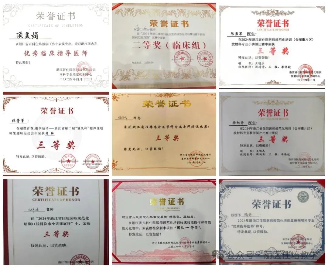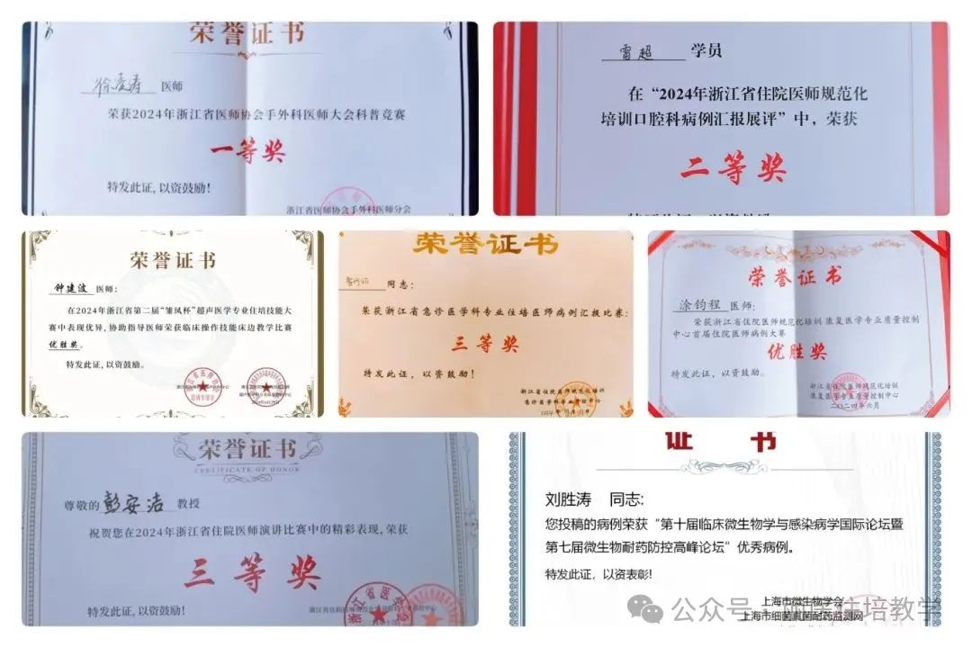 我院2011年成为“首批浙江省住院医师规范化培训基地”,2013年度获得“浙江省住院医师规范化培训临床技能培训中心建设项目”资格,2013年度获得“国家卫计委首批全科医生规范化培养基地建设项目”资格,2014年成为“国家第一批住院医师规范化培训基地”,目前规培学科包括内科、外科、妇产科、儿科、神经内科等16个专业。目前基地在培学员249人,本单位学员70人、外单位学员137人、全日制研究生42人。基地建立了住院医师规范化培训基地领导小组、学科工作小组、管理小组、督导考核小组等组织管理机构,制定了领导小组、学科工作小组、督导考核小组、学科组长、带教秘书、指导老师职责,各岗位职责分工明确、落实到位。2024年住培结业理论首考通过率与执业医师考试通过率为分别为98.53%、91.42%。