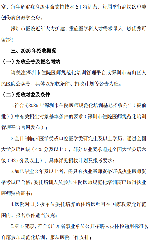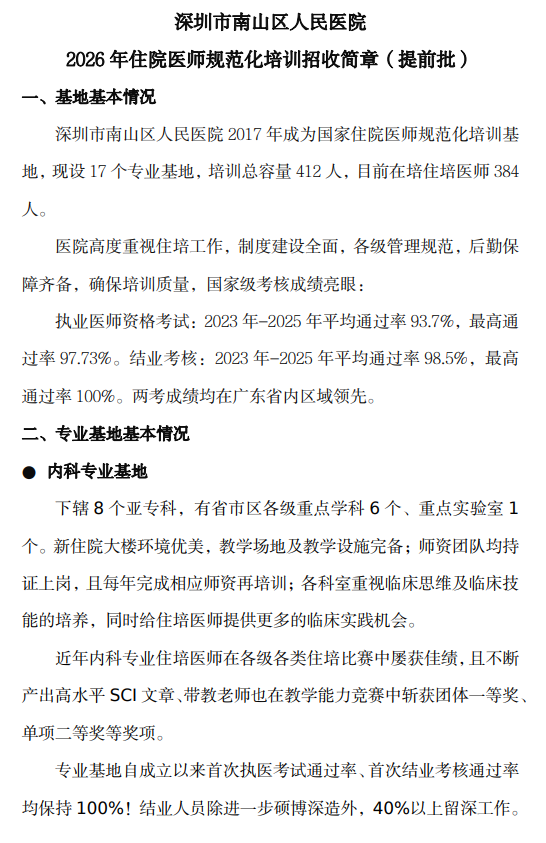 深圳市南山区人民医院2026年住院医师规范化培训招收简章(提前批)