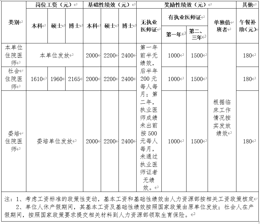 (二)医院不断完善住院医师待遇和绩效制度。社会住培医师待遇包括岗位工资、绩效补助、午餐补助、五项保险、晚夜班费等。住院医师在我院总收入每月4000-8000元(见附表),医院根据不同学历、年级、是否取得执业资格予以不同补助;根据临床工作情况发放绩效。体现多劳多得,少劳少得,不劳不得。根据住院医师是否取得执业资格、临床能力评估与考核、处方权考核等相关因素安排单独值班。
