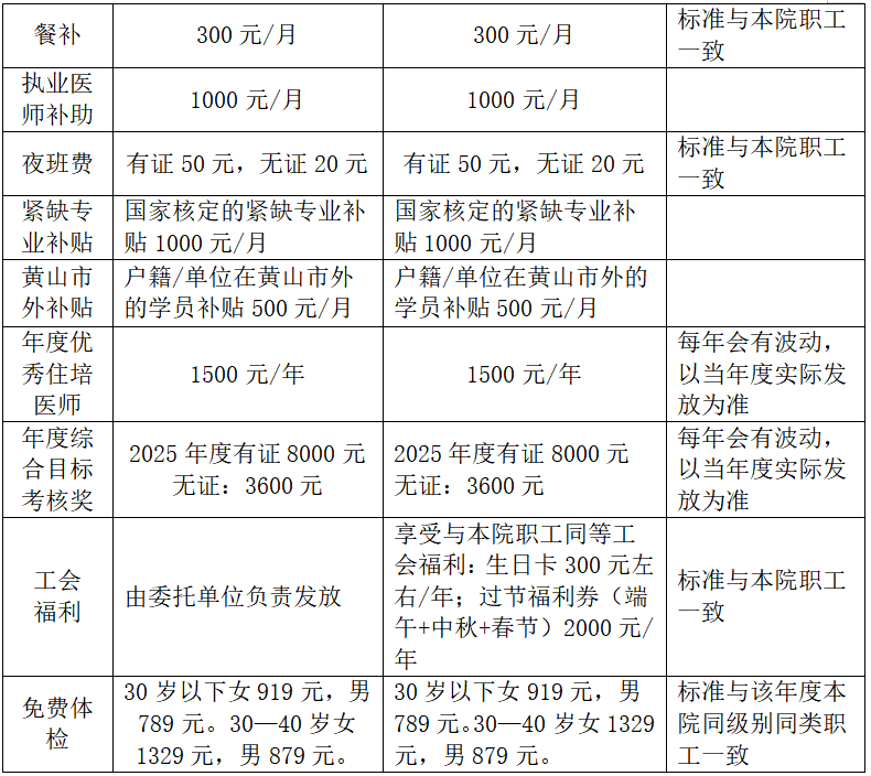 住培医师(社会人)第一年收入可达人均10万元左右,第二年人均12万元左右,第三年人均13万元左右。为所有住培学员免费提供住宿;每年享有一次免费健康体检;免费办理黄山市人民医院电子图书馆账号;免费提供医院统一工作服(夏装、冬装各两套)。