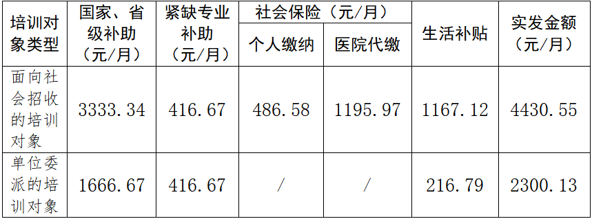 1.面向社会招收的培训对象入培后即与我院签订培训劳动合同,明确培训期间双方的权利义务。面向社会招收的培训对象在培训期间的社会保险缴纳由培训基地按社会保险法等相关法律法规、文件规定执行,社会保险中单位缴纳部分由我院自筹资金另行出资代缴。