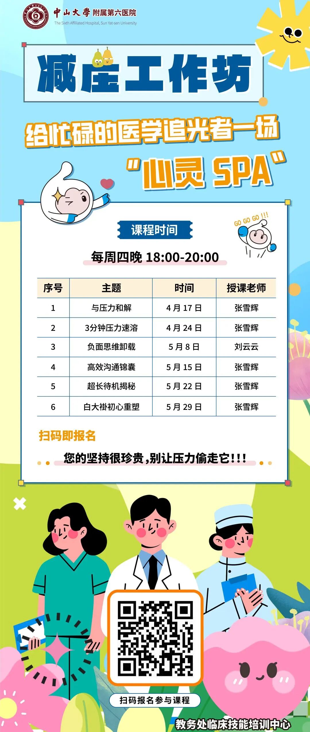 我院临床技能培训中心于2025年11月率先建成“医学人文场所精神”实体空间,定期开设住培减压工作坊并与院级情景模拟系列课程等课程体系深度融合,帮助学员缓解工作压力、提升临床应对能力,持续引领医务工作者在精湛技能与深厚人文的同步滋养下,成长为德才兼备的卓越医者。
