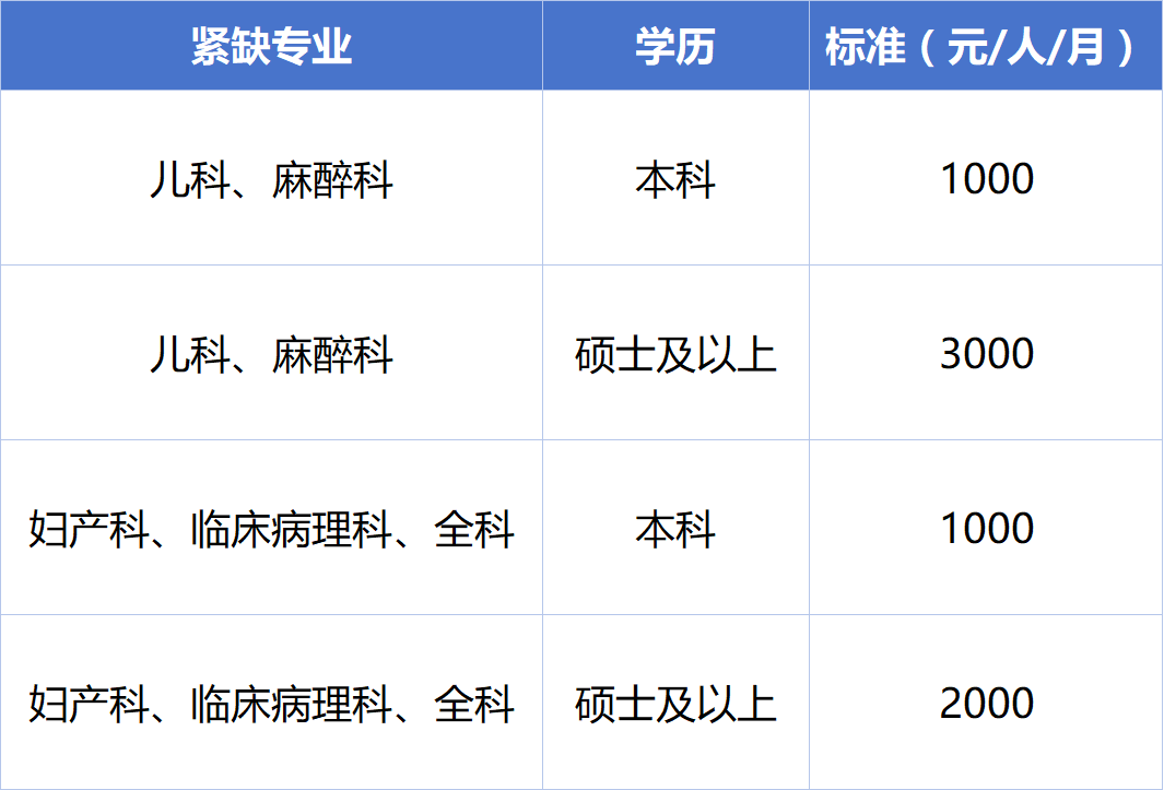 5.入培前已取得执业医师证或在我院一次性通过执业医师资格考试的紧缺专业学员,在我院完成执业注册后可申请领取紧缺专业补贴,补贴标准如下。