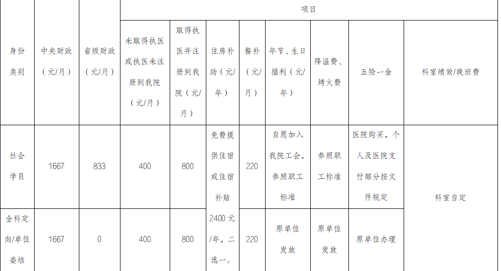(三)面向社会招收的培训对象与医院签订培训协议,培训对象自行到当地人才中心办理人事代理业务。培训期间的生活补助由医院负责发放,标准参照同等条件住院医师工资水平确定,社会化招录人员培训结束后自行择业。基地不负责学员就业及工作安置,对表现优秀的学员,可向医院有关部门和各临床专科优先推荐。积极为学员自主择业提供必要的支持与协助。