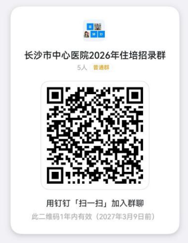报名人员需扫描下方二维码加入“长沙市中心医院2026年住培招录群”官方钉钉群,并以“姓名--第一/第二志愿--报名专业”实名备注。后续所有招录通知、线上答疑、考试安排等,均将在群内第一时间发布。