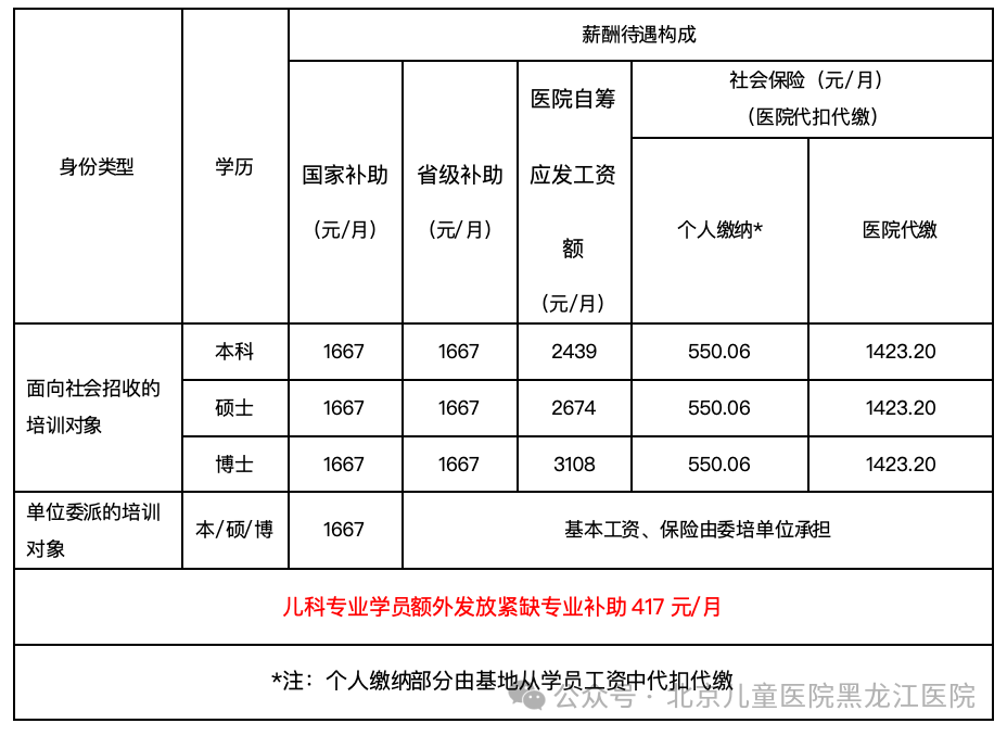(1)基本生活补助:根据国务院办公厅《关于加快医学教育创新发展的指导意见》(国办发〔2020〕34号)文件要求,保障住院医师合理待遇,面向社会招收的培训对象入培后即与我院签订劳动合同和培训协议,明确培训期间双方的权利义务。面向社会招收的培训对象在培训期间的社会保险缴纳由培训基地按社会保险法等相关法律、法规、文件规定执行。社会保险中医院代缴部分由我院自筹资金另行出资代缴。儿科紧缺专业培训对象在原有的补助基础上,每人每年增加5000元,按月发放。