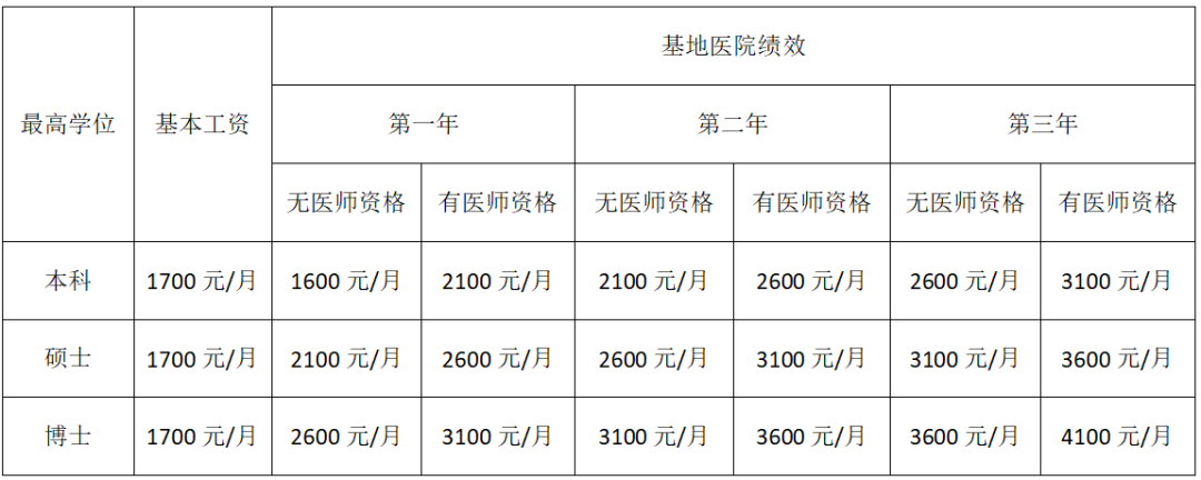 (3)培训身份为本单位住院医师,基本工资按照医院人事相关规定保持不变,绩效为3200元/月(无医师资格证)、3700元/月(有医师资格证)。