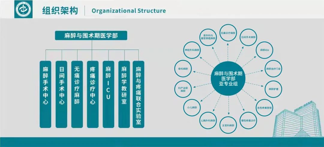 麻醉与围术期医学部现有医护人员851名(麻醉医师219人,麻醉护士201人,手术室护士410人,病房护士21人);设有麻醉手术中心、日间手术中心、无痛诊疗中心、疼痛诊疗中心、麻醉ICU、麻醉治疗门诊、麻醉学教研室及麻醉与疼痛联合实验室等部门;承担全院的临床麻醉、舒适化诊疗、急慢性疼痛诊疗、麻醉后监护与诊疗、危重患者救治及急救复苏等临床工作。学部现开放手术间230个,包括术中 MRI、CT、DSA、机器人、门诊、介入手术间;恢复室床位122 张。2021年完成手术麻醉量31.08万例(手术室内麻醉16.21万例,手术室外麻醉14.86万例),其中达芬奇机器人手术麻醉达1952例,位于全国前列;疼痛诊疗中心门诊量34579人次,病房收治病2719人次,手术1237台,微创治疗7157人次;麻醉ICU现有床位14张,收治患者1679人次。
