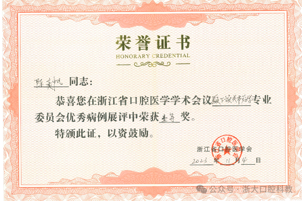 3.专业赋能发展。近年来,基地学员在各类比赛中取得了优异成绩,如2023年浙江省口腔医学学术年会优秀病例一等奖、二等奖。优秀学员在国内外学术会议上发言。基地教师也多次获得“优秀带教教师”“优秀新生之友”等称号。此外,口腔颌面外科课程组获得浙大口腔2024年“团队贡献”奖。