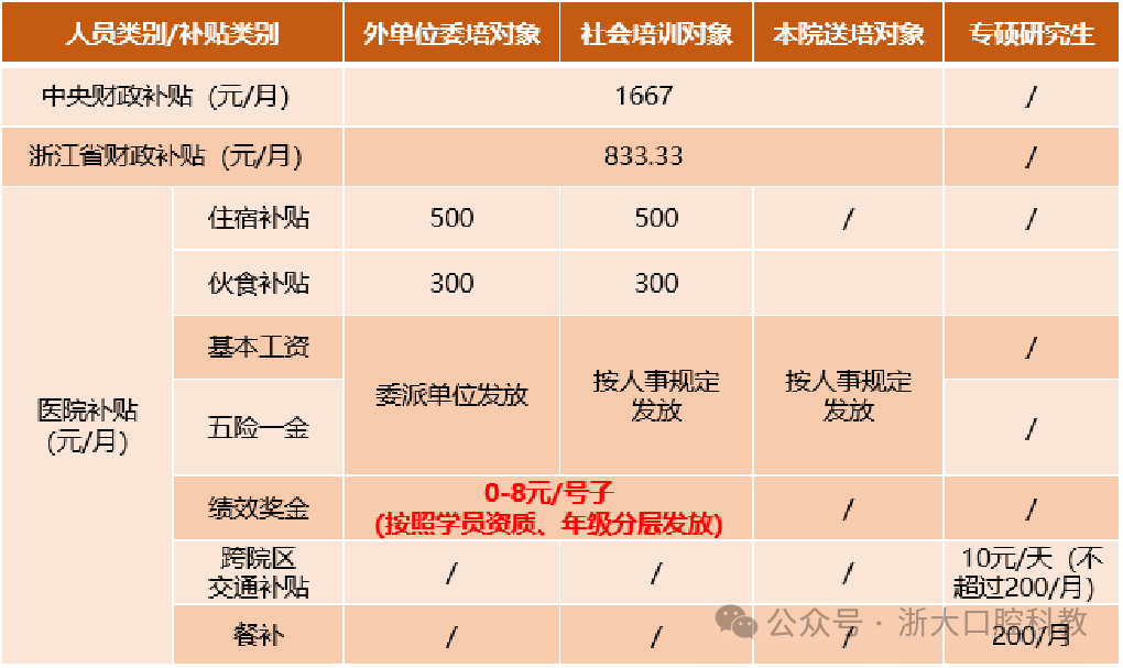 医院每年根据《中央财政专项支持住院医师规培》(2014年9⽉9日国家卫生计生委科技教育司发布)、《公立医院补助资金管理暂行办法》(财社[2015]256号)及各级部门关于住院医师规范化培训财政使用相关制度等规定,规范使用中央和地方财政补助经费。并建立医院自有资金住培专项经费账户,用于住培师资培训、师资绩效发放、住院医师补贴、评奖评优奖励等。培训对象待遇如下: