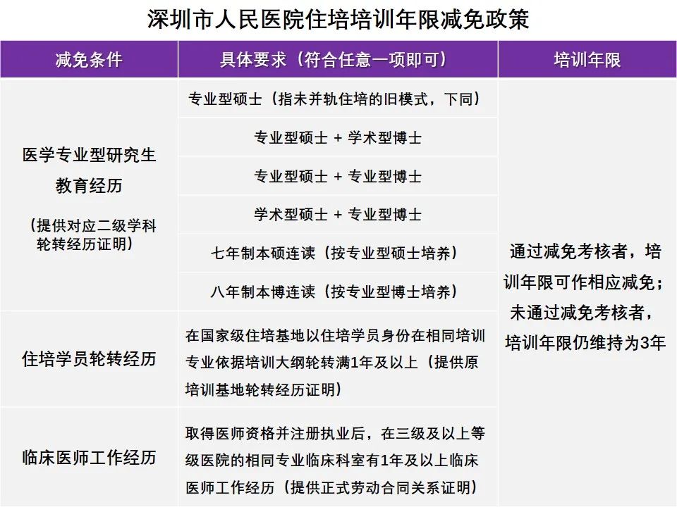 培训年限一般为3年,符合以下减免条件者,可在入培报到时申请参加减免考核(含理论和技能考核),通过考核者可依据既往临床经历和考核综合表现减免相应的培训年限,未通过考核者将继续维持培训年限为3年。