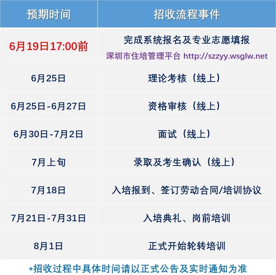 请登陆深圳市住培管理平台szzyy.wsglw.net,注册并完成专业基地志愿填报,按照深圳市统一招收和录取流程进行后续事宜,详细内容请见平台最新发布的公告。