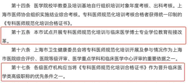 上海还试点开展专科医师规范化培训与临床医学博士专业学位教育衔接改革。将《专科医师规范化培训合格证书》作为晋升临床医学类高级职称的优先条件之一,也就是说专培合格可获博士学位,且把专培与职称晋升挂钩!