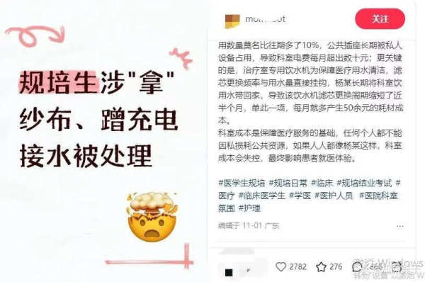 11月1日,广东某医院一名医生透露,一名规培生被训诫处罚了。这名医生表示:“事发当日清晨,护士长在科室更衣室例行巡查时,发现规培生杨某某衣兜内装有一包未登记领用的无菌纱布,追问中进一步发现,杨某随身携带的私人充电宝长期在科室办公室插座充电,且其个人水壶多次在科室专用饮水机接水后带回家饮用。”