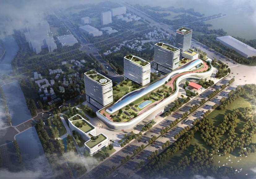 医院新院区简介: 江门市中心医院新院区建设用地面积 11 . 4 万 ㎡,规划床位 1500床(最大床位2000床)。新院区最北侧为公共卫生中心,中部为综合诊疗区,包括急救中心,综合门诊,中心医技,住院楼。南侧区块包含内科住院楼,体检、生殖中心,行政及后勤综合楼。