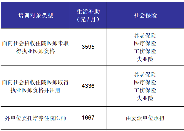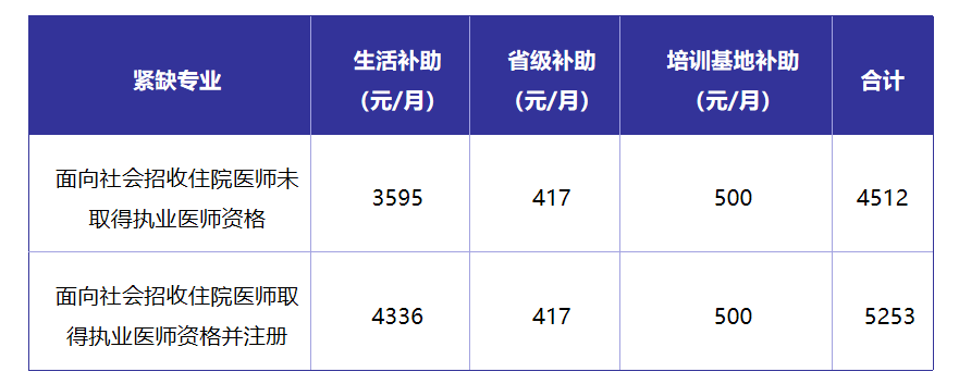 4.全科、儿科、妇产科、麻醉科、急诊科、临床病理科、重症医学科为紧缺专业,额外发放省级紧缺专业补助,每人每月417元,同时培训基地给予补助每人每月500元。具体如下待遇: