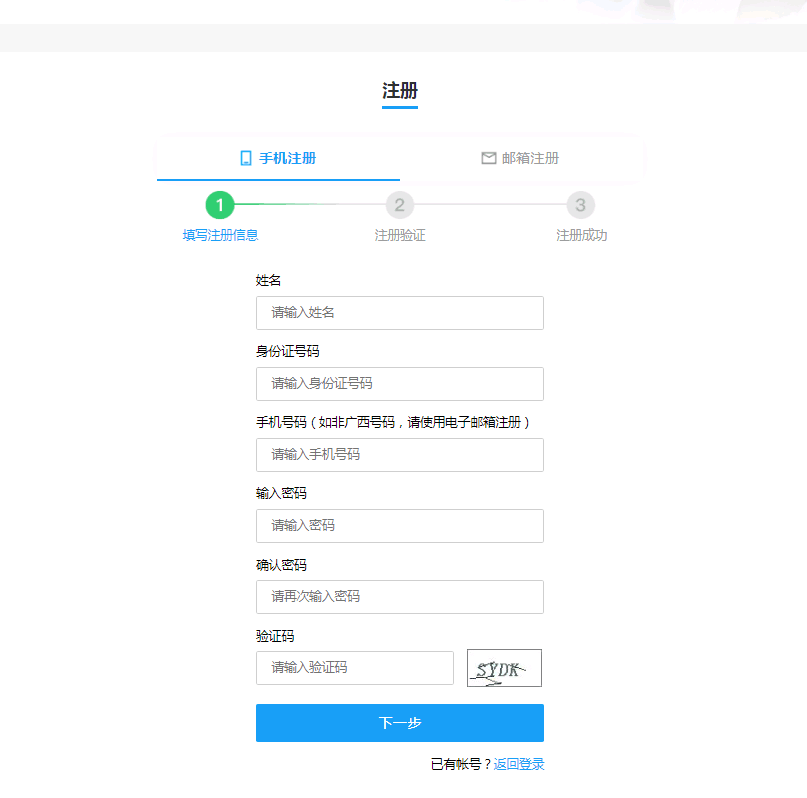 (2)注册时可选择【手机注册】或【邮箱注册】填写注册信息完成后点击【下一步】。注:非广西本地手机号请使用邮箱注册。