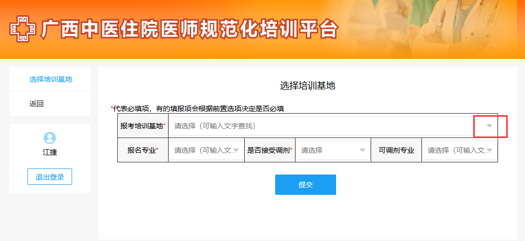 (4)考生填写好个人信息后,点击【下一步】可选择培训基地信息。填写完成后点击【提交】。