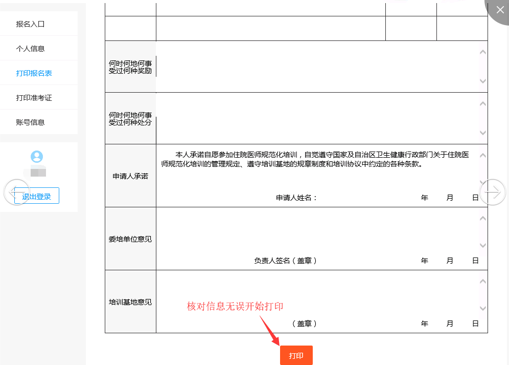 报名信息审核通过后,可打印报名表。点击【打印报名表】进入核对界面,下拉检查报名申请信息无误后,点击【打印】即可。