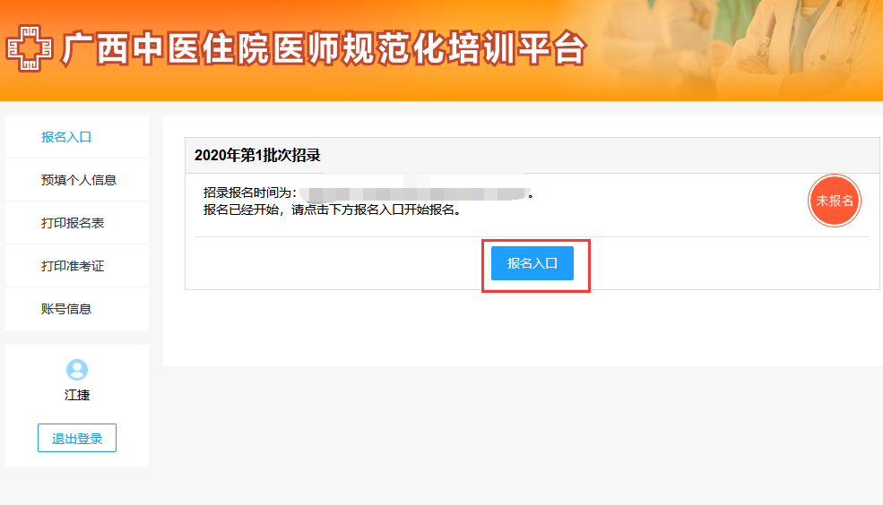 (1)登录完成后,如在报名期,点击中间的【报名入口】开始填写培训报名申请表。